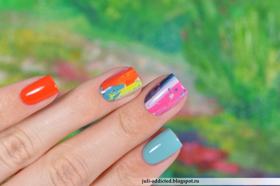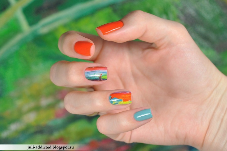 Для маникюра я выбрала два ярких оттенка: припыленно-мятный “Jupiter Blue” и красно-оранжевый“Eye-Poppie”. Поженить их друг с другом я решила при помощи недорогих китайских наклеек “Yi Kou”. Мне понравилось, по оттенкам все друг к другу подошло и получилось по-летнему ярко и не скучно.